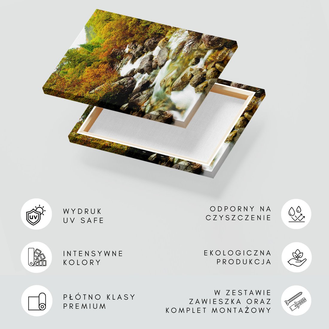 Obraz na płótnie z motywem rzeka, las, kamienie to kwintesencja estetyki i trwałości. Dzięki łatwemu montażowi i uniwersalnemu wzornictwu, czyni go idealnym wyborem zarówno do codziennego użytku, jak i na wyrafinowany prezent.