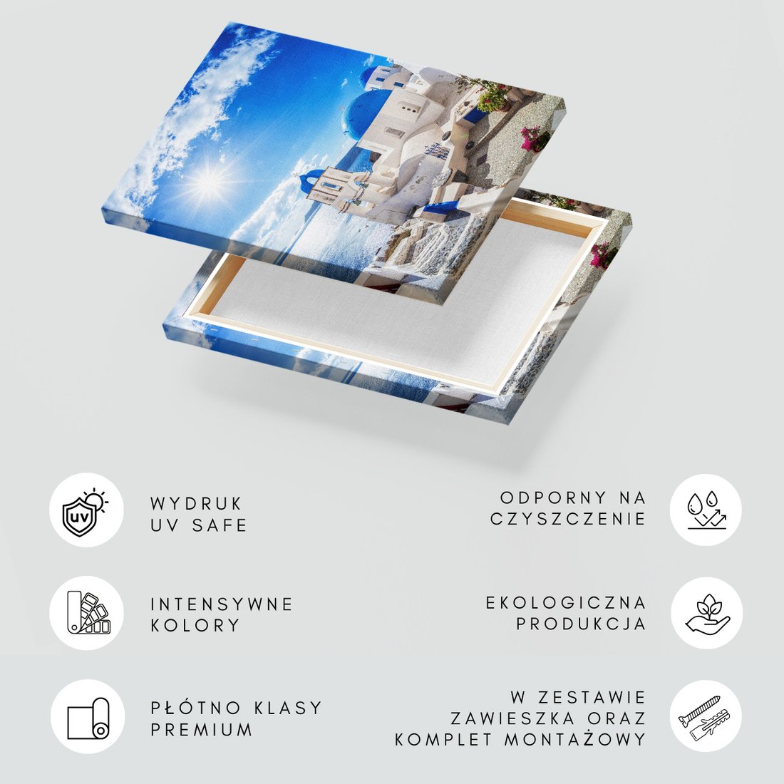 Obraz na płótnie z motywem Santorini, Grecja, architektura to kwintesencja estetyki i trwałości. Dzięki łatwemu montażowi i uniwersalnemu wzornictwu, czyni go idealnym wyborem zarówno do codziennego użytku, jak i na wyrafinowany prezent.