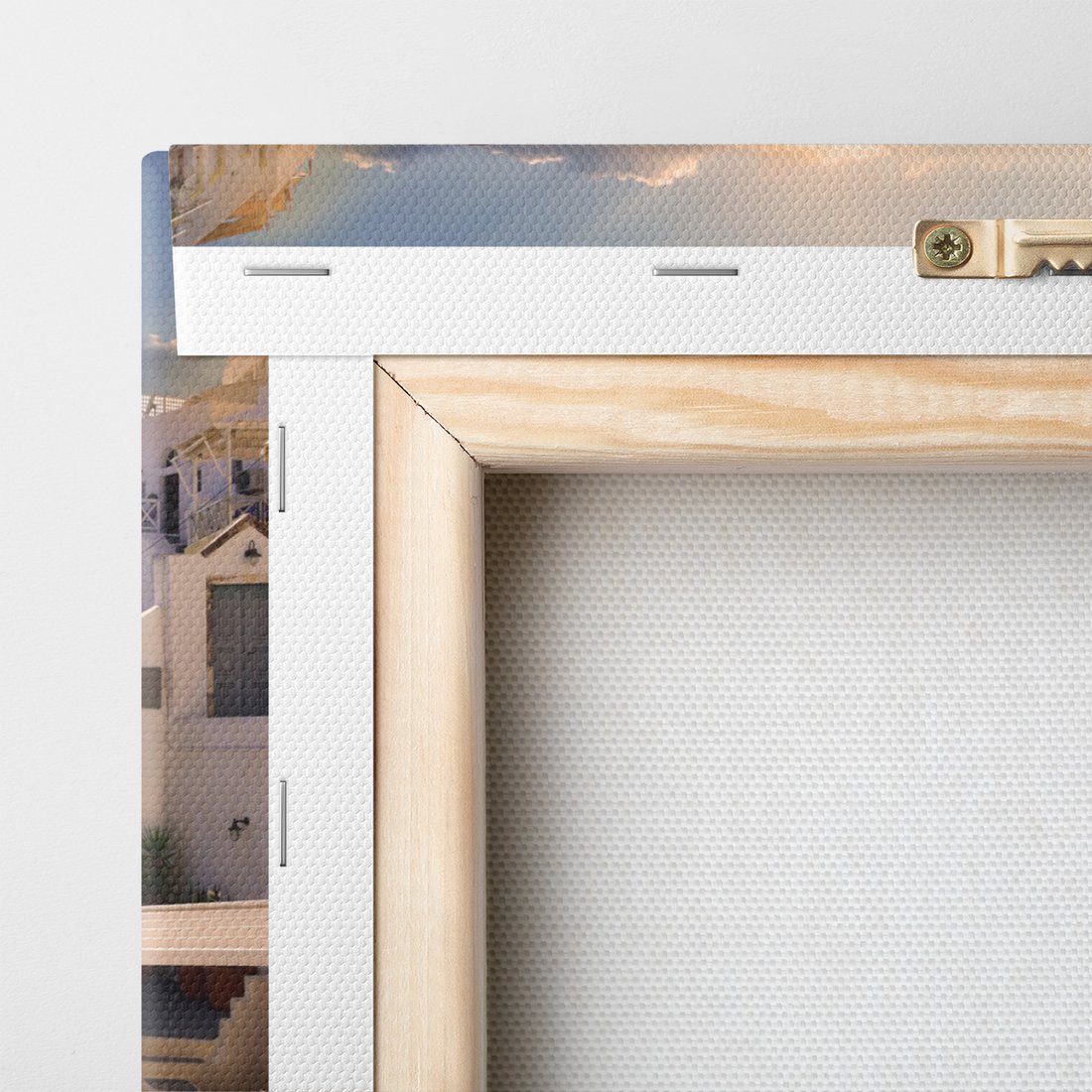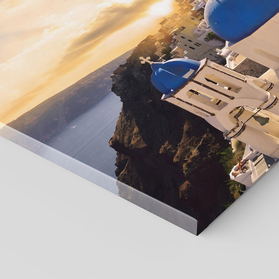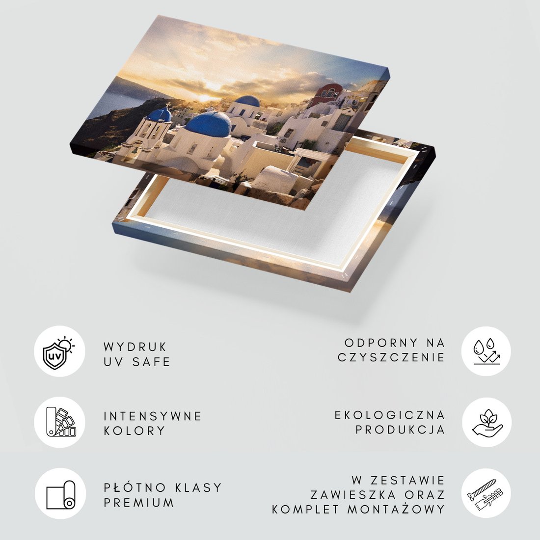 Obraz na płótnie z motywem Santorini, Grecja, miasto to kwintesencja estetyki i trwałości. Dzięki łatwemu montażowi i uniwersalnemu wzornictwu, czyni go idealnym wyborem zarówno do codziennego użytku, jak i na wyrafinowany prezent.