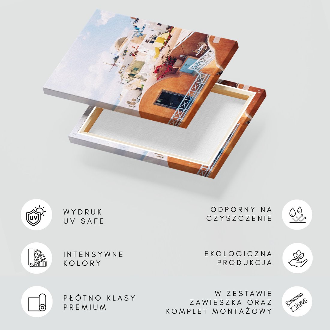 Obraz na płótnie z motywem Santorini, Grecja, miasto to kwintesencja estetyki i trwałości. Dzięki łatwemu montażowi i uniwersalnemu wzornictwu, czyni go idealnym wyborem zarówno do codziennego użytku, jak i na wyrafinowany prezent.