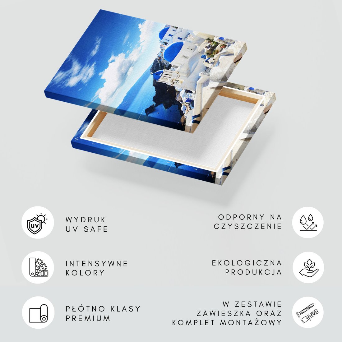 Obraz na płótnie z motywem Santorini, Grecja, morze to kwintesencja estetyki i trwałości. Dzięki łatwemu montażowi i uniwersalnemu wzornictwu, czyni go idealnym wyborem zarówno do codziennego użytku, jak i na wyrafinowany prezent.