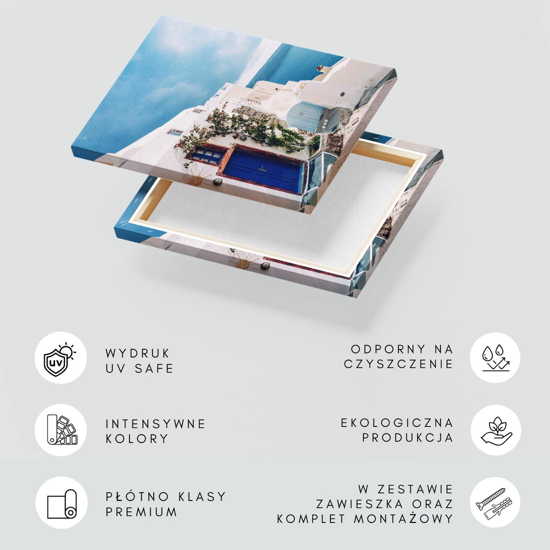 Obraz na płótnie z motywem Santorini, Grecja, morze to kwintesencja estetyki i trwałości. Dzięki łatwemu montażowi i uniwersalnemu wzornictwu, czyni go idealnym wyborem zarówno do codziennego użytku, jak i na wyrafinowany prezent.