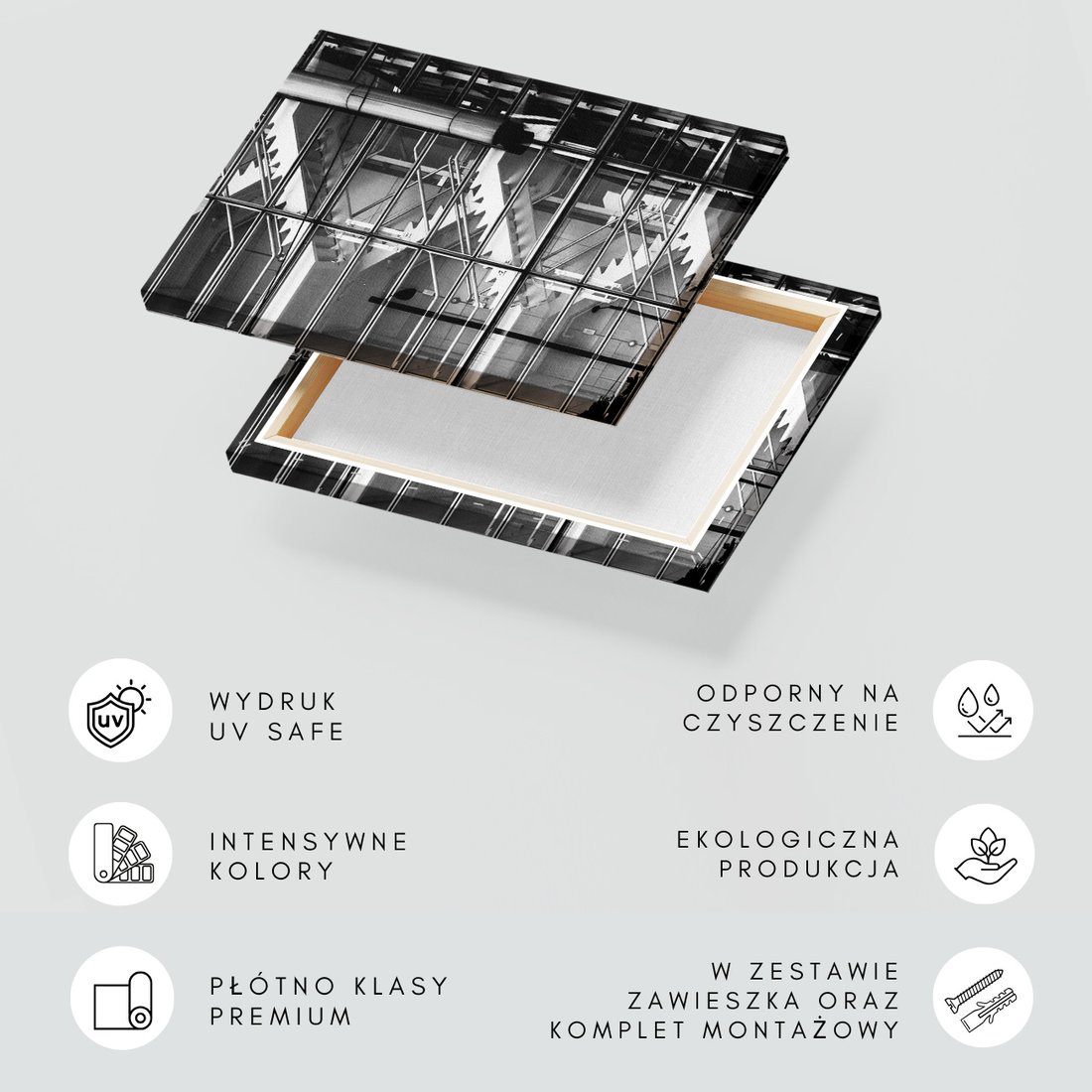Obraz na płótnie z motywem schody, budynek, okna to kwintesencja estetyki i trwałości. Dzięki łatwemu montażowi i uniwersalnemu wzornictwu, czyni go idealnym wyborem zarówno do codziennego użytku, jak i na wyrafinowany prezent.