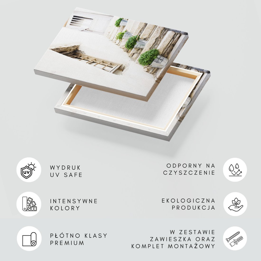 Obraz na płótnie z motywem schody, kwiaty, doniczki to kwintesencja estetyki i trwałości. Dzięki łatwemu montażowi i uniwersalnemu wzornictwu, czyni go idealnym wyborem zarówno do codziennego użytku, jak i na wyrafinowany prezent.