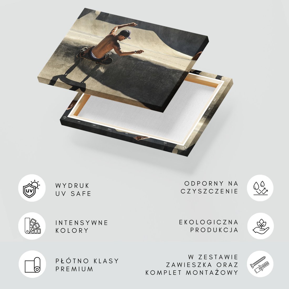 Obraz na płótnie z motywem skatepark, sport, rampa to kwintesencja estetyki i trwałości. Dzięki łatwemu montażowi i uniwersalnemu wzornictwu, czyni go idealnym wyborem zarówno do codziennego użytku, jak i na wyrafinowany prezent.