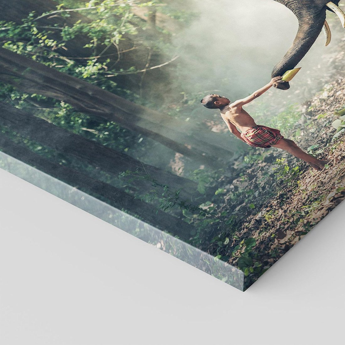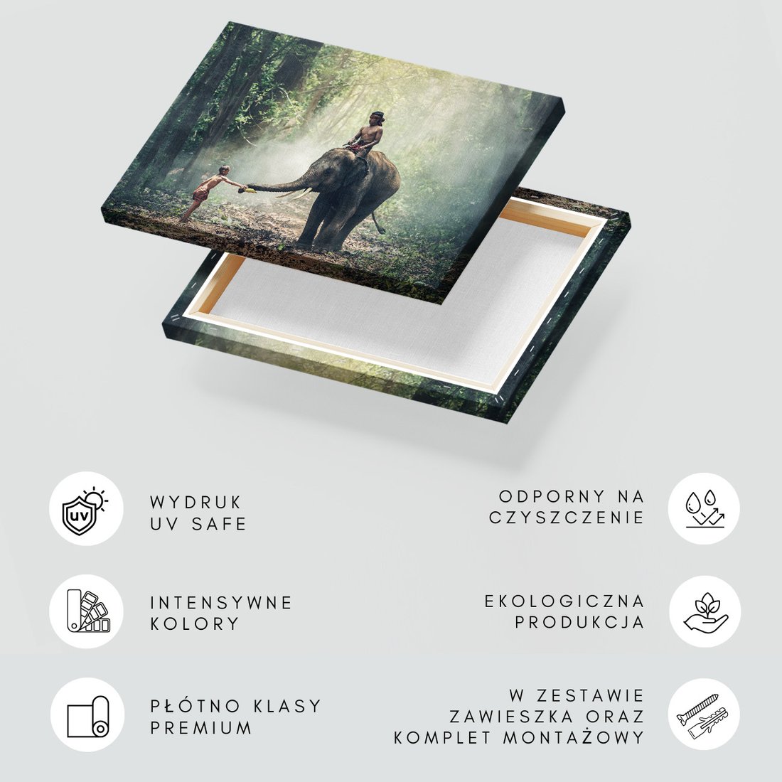 Obraz na płótnie z motywem słoń, chłopiec, las to kwintesencja estetyki i trwałości. Dzięki łatwemu montażowi i uniwersalnemu wzornictwu, czyni go idealnym wyborem zarówno do codziennego użytku, jak i na wyrafinowany prezent.
