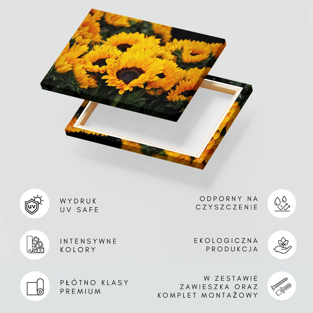 Obraz na płótnie z motywem słoneczniki, kwiaty, żółty to kwintesencja estetyki i trwałości. Dzięki łatwemu montażowi i uniwersalnemu wzornictwu, czyni go idealnym wyborem zarówno do codziennego użytku, jak i na wyrafinowany prezent.