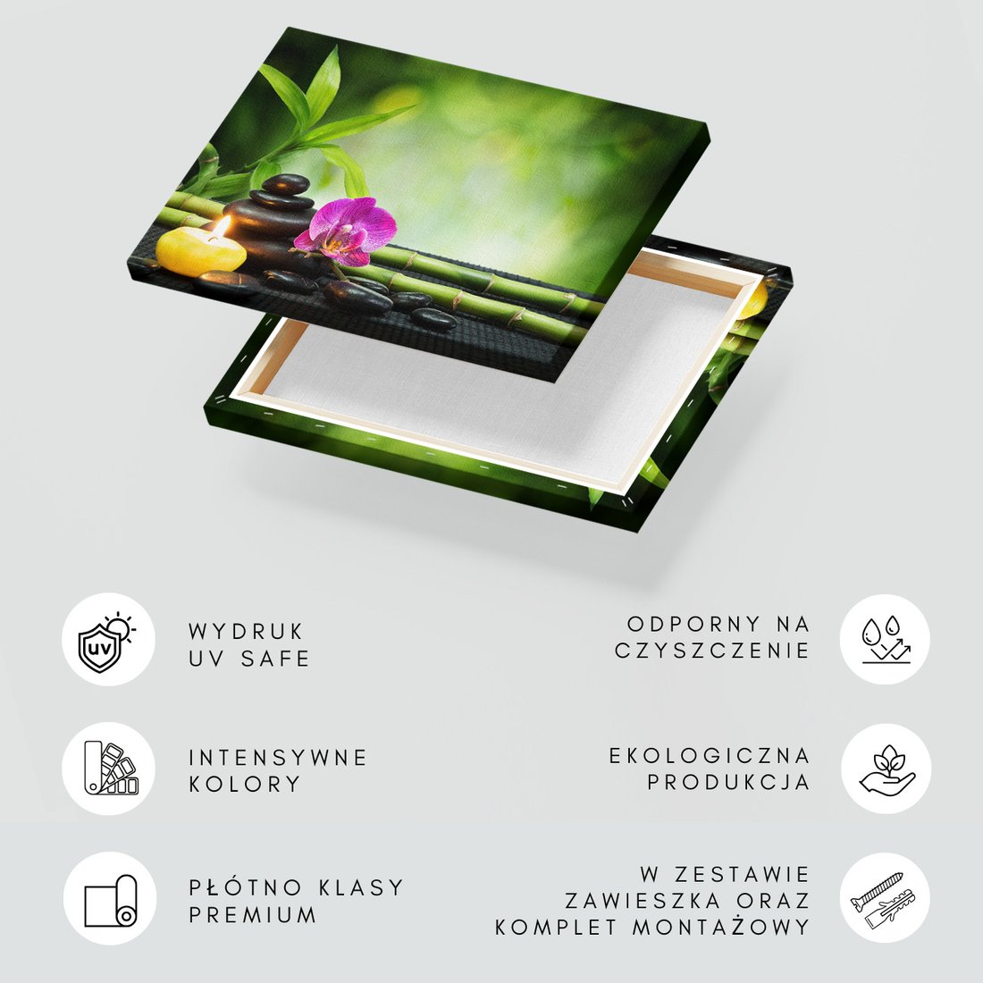 Obraz na płótnie z motywem spa, relaks, orchidea to kwintesencja estetyki i trwałości. Dzięki łatwemu montażowi i uniwersalnemu wzornictwu, czyni go idealnym wyborem zarówno do codziennego użytku, jak i na wyrafinowany prezent.