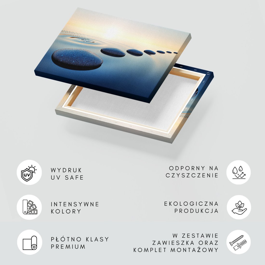Obraz na płótnie z motywem spokój, woda, kamienie to kwintesencja estetyki i trwałości. Dzięki łatwemu montażowi i uniwersalnemu wzornictwu, czyni go idealnym wyborem zarówno do codziennego użytku, jak i na wyrafinowany prezent.
