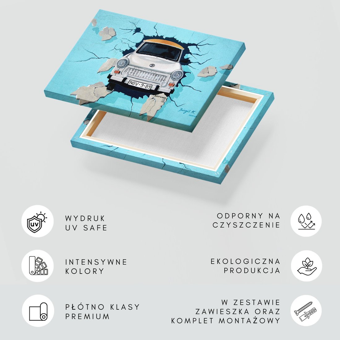 Obraz na płótnie z motywem Trabant, mur, auto to kwintesencja estetyki i trwałości. Dzięki łatwemu montażowi i uniwersalnemu wzornictwu, czyni go idealnym wyborem zarówno do codziennego użytku, jak i na wyrafinowany prezent.