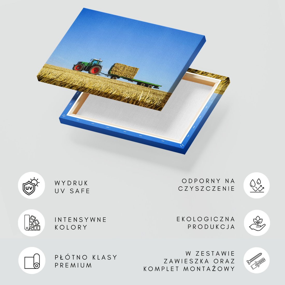 Obraz na płótnie z motywem traktor, pole, niebo to kwintesencja estetyki i trwałości. Dzięki łatwemu montażowi i uniwersalnemu wzornictwu, czyni go idealnym wyborem zarówno do codziennego użytku, jak i na wyrafinowany prezent.