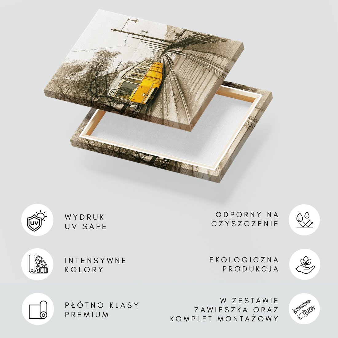 Obraz na płótnie z motywem tramwaj, miasto, transport to kwintesencja estetyki i trwałości. Dzięki łatwemu montażowi i uniwersalnemu wzornictwu, czyni go idealnym wyborem zarówno do codziennego użytku, jak i na wyrafinowany prezent.