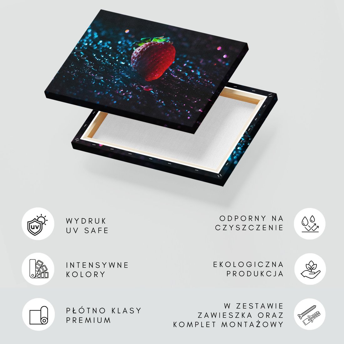 Obraz na płótnie z motywem truskawka, owoce, krople to kwintesencja estetyki i trwałości. Dzięki łatwemu montażowi i uniwersalnemu wzornictwu, czyni go idealnym wyborem zarówno do codziennego użytku, jak i na wyrafinowany prezent.