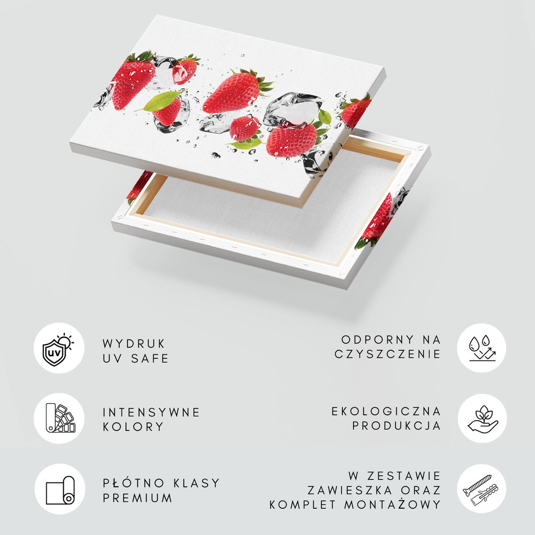 Obraz na płótnie z motywem truskawki, lód, świeżość to kwintesencja estetyki i trwałości. Dzięki łatwemu montażowi i uniwersalnemu wzornictwu, czyni go idealnym wyborem zarówno do codziennego użytku, jak i na wyrafinowany prezent.
