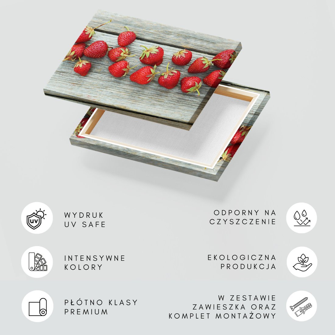 Obraz na płótnie z motywem truskawki, owoce, drewno to kwintesencja estetyki i trwałości. Dzięki łatwemu montażowi i uniwersalnemu wzornictwu, czyni go idealnym wyborem zarówno do codziennego użytku, jak i na wyrafinowany prezent.