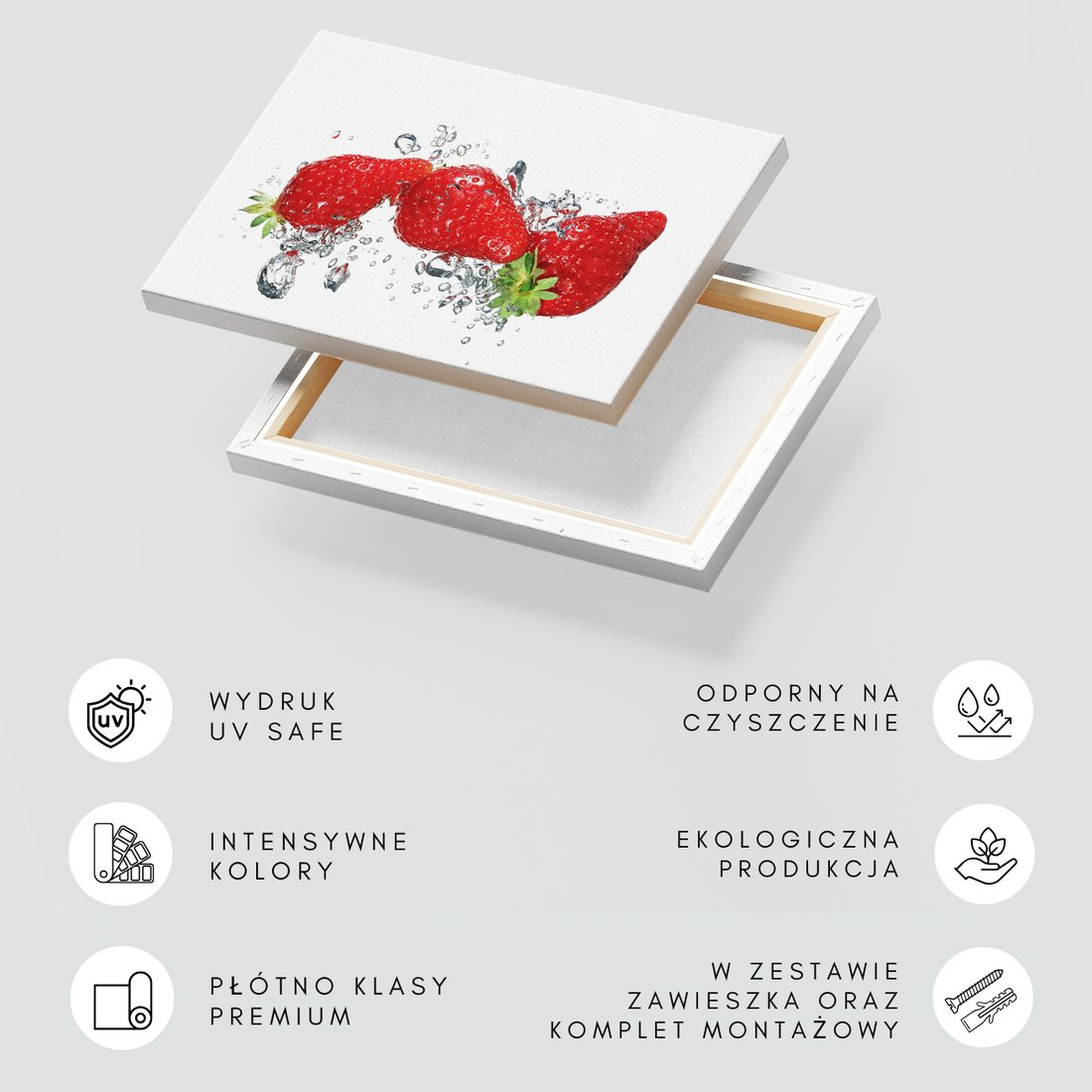 Obraz na płótnie z motywem truskawki, owoce, woda to kwintesencja estetyki i trwałości. Dzięki łatwemu montażowi i uniwersalnemu wzornictwu, czyni go idealnym wyborem zarówno do codziennego użytku, jak i na wyrafinowany prezent.
