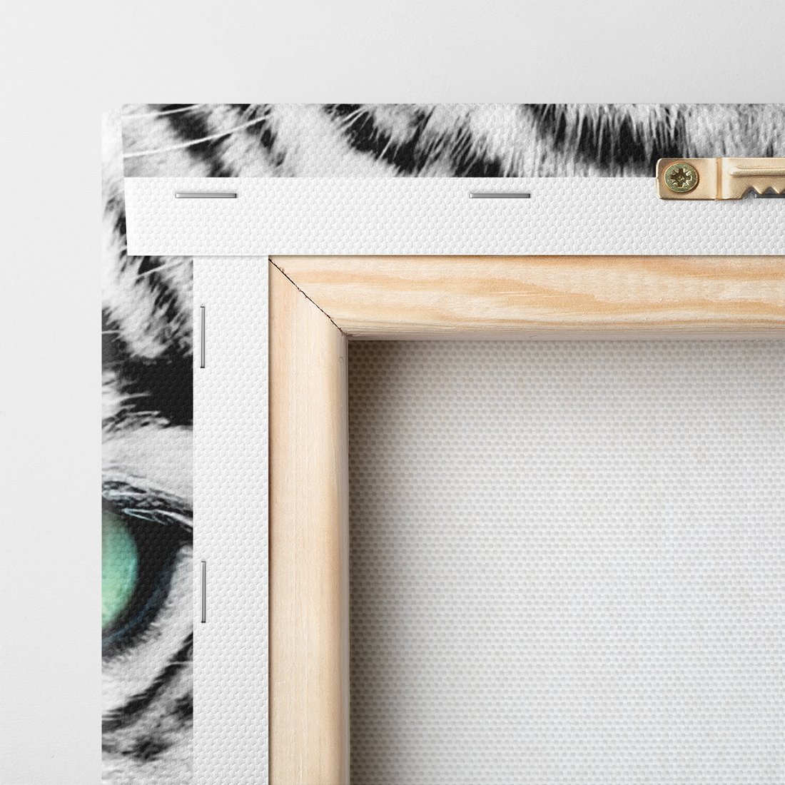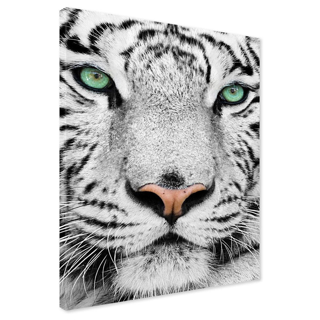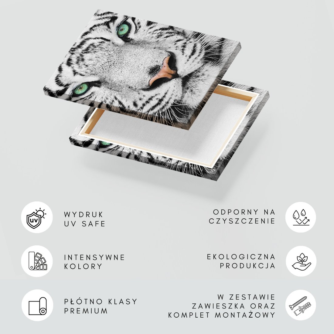 Obraz na płótnie z motywem tygrys, biały, zwierzę to kwintesencja estetyki i trwałości. Dzięki łatwemu montażowi i uniwersalnemu wzornictwu, czyni go idealnym wyborem zarówno do codziennego użytku, jak i na wyrafinowany prezent.