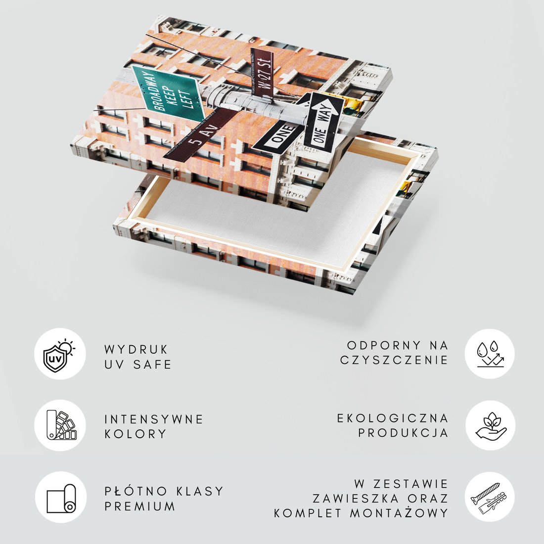 Obraz na płótnie z motywem ulica, znaki, miasto to kwintesencja estetyki i trwałości. Dzięki łatwemu montażowi i uniwersalnemu wzornictwu, czyni go idealnym wyborem zarówno do codziennego użytku, jak i na wyrafinowany prezent.