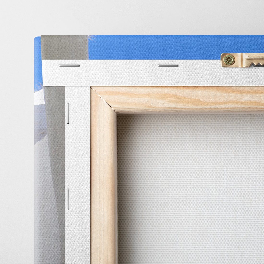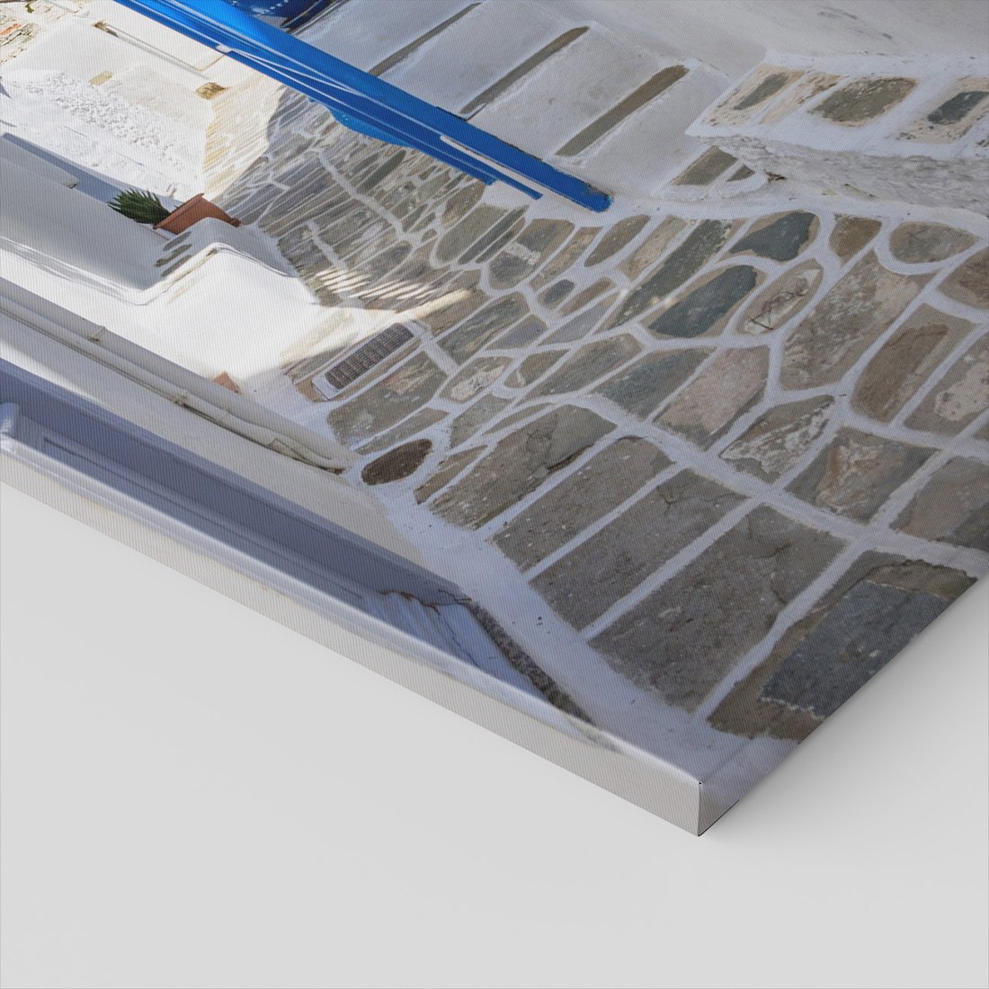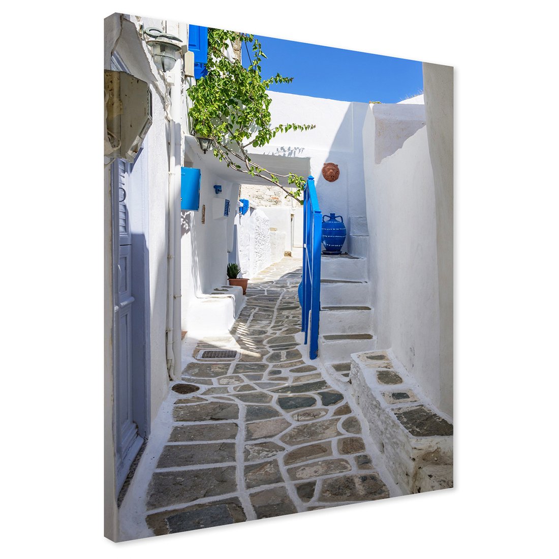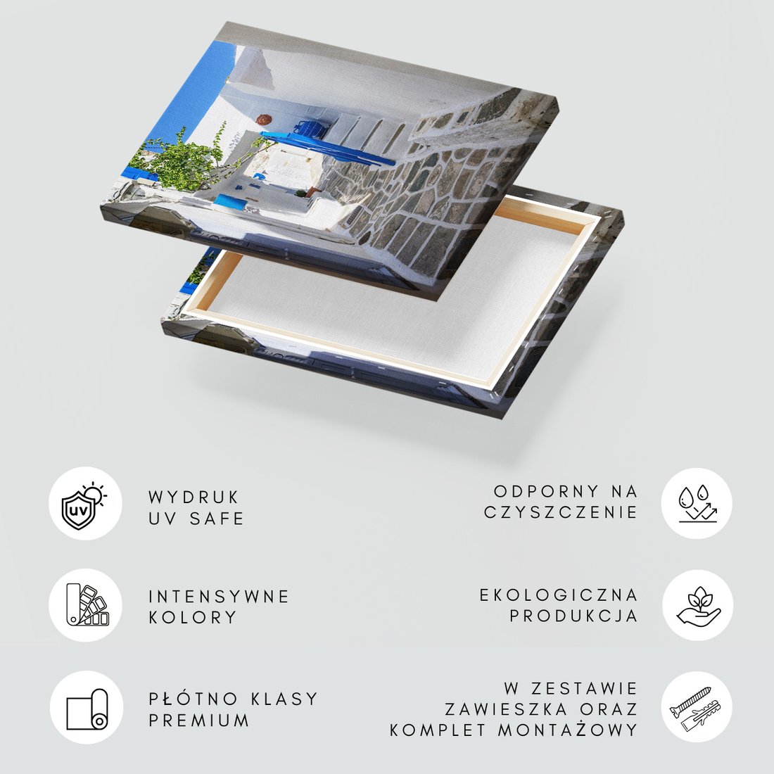 Obraz na płótnie z motywem uliczka, białe budynki, niebieskie akcenty to kwintesencja estetyki i trwałości. Dzięki łatwemu montażowi i uniwersalnemu wzornictwu, czyni go idealnym wyborem zarówno do codziennego użytku, jak i na wyrafinowany prezent.