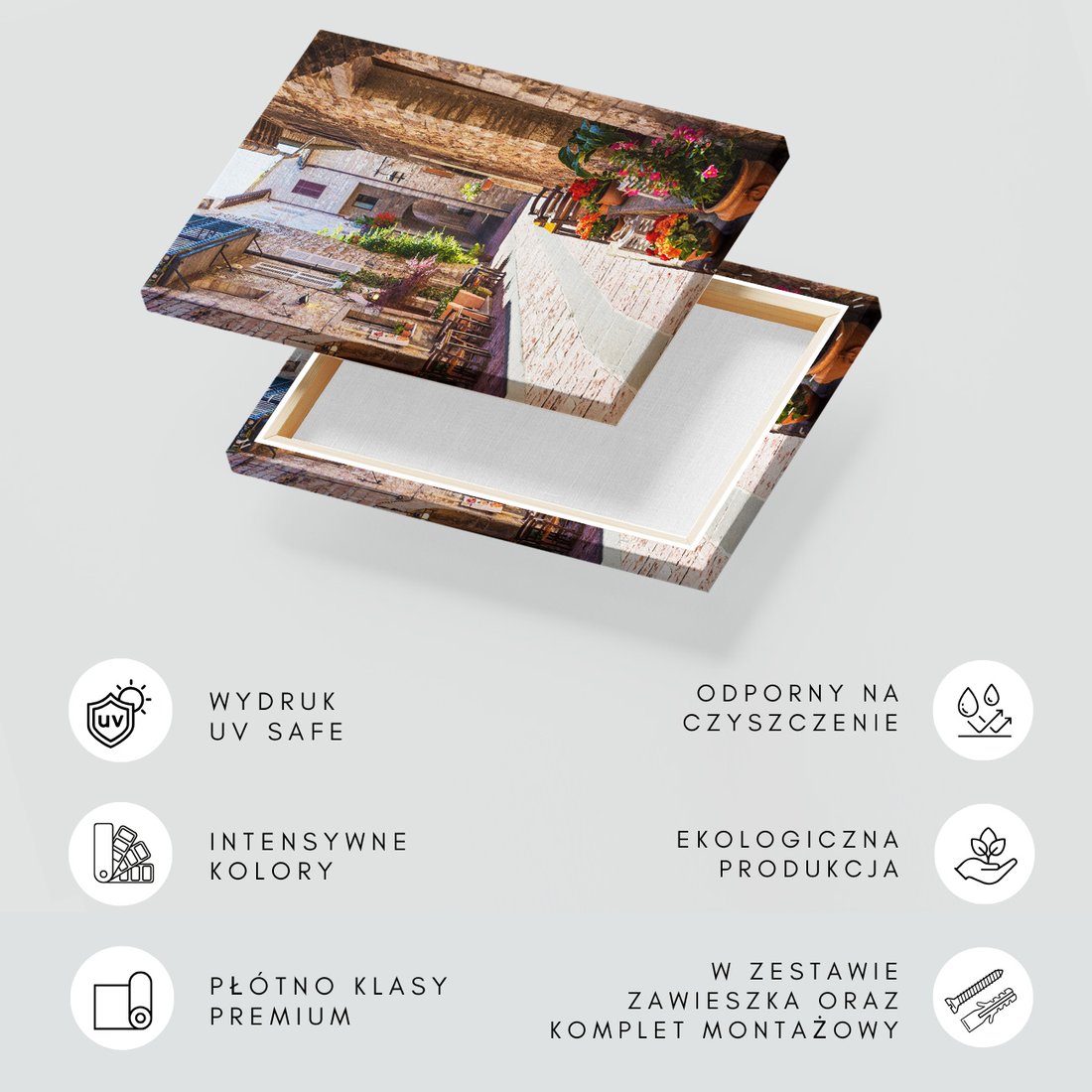 Obraz na płótnie z motywem uliczka, kwiaty, architektura to kwintesencja estetyki i trwałości. Dzięki łatwemu montażowi i uniwersalnemu wzornictwu, czyni go idealnym wyborem zarówno do codziennego użytku, jak i na wyrafinowany prezent.