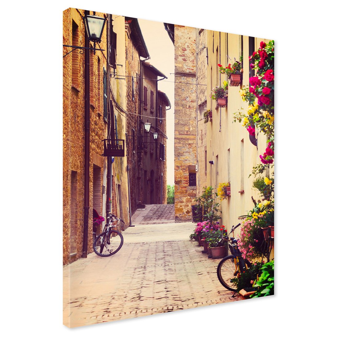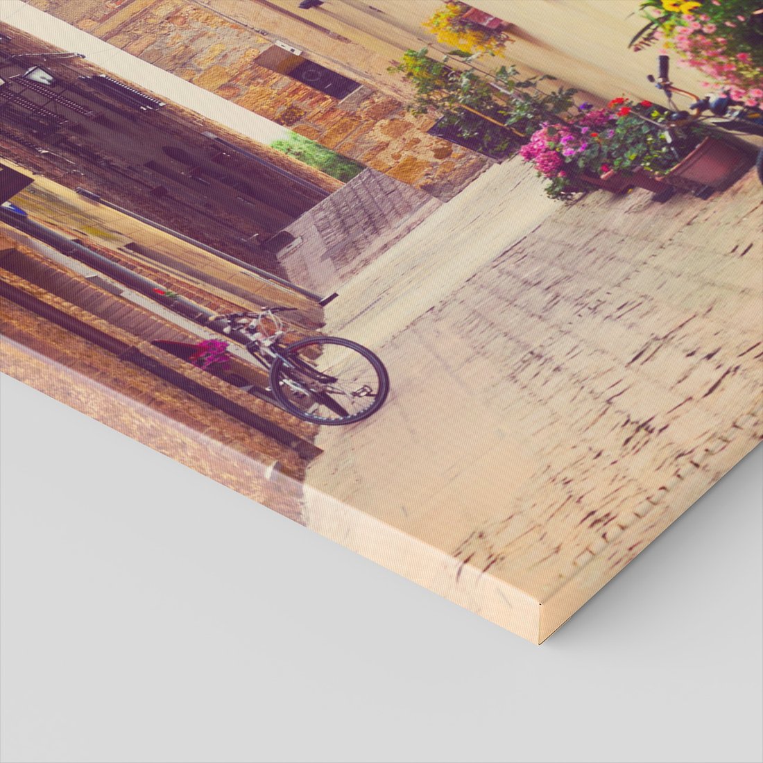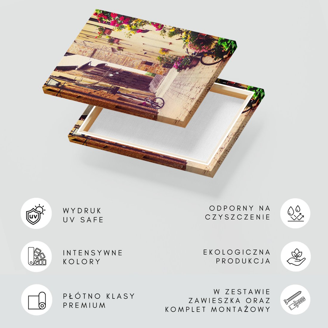 Obraz na płótnie z motywem uliczka, kwiaty, rowery to kwintesencja estetyki i trwałości. Dzięki łatwemu montażowi i uniwersalnemu wzornictwu, czyni go idealnym wyborem zarówno do codziennego użytku, jak i na wyrafinowany prezent.