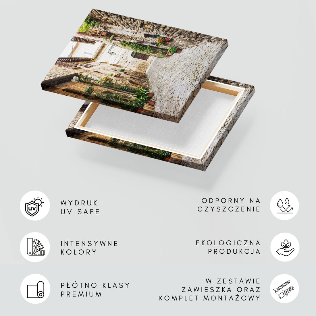 Obraz na płótnie z motywem uliczka, miasto, kamień, to kwintesencja estetyki i trwałości. Dzięki łatwemu montażowi i uniwersalnemu wzornictwu, czyni go idealnym wyborem zarówno do codziennego użytku, jak i na wyrafinowany prezent.