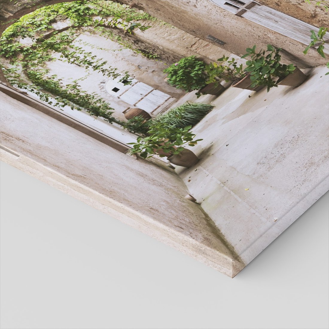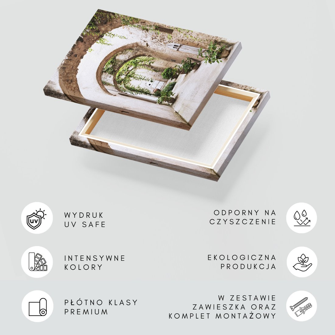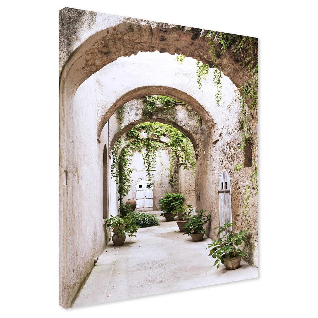 Obraz na płótnie z motywem uliczka, rośliny, łuki to kwintesencja estetyki i trwałości. Dzięki łatwemu montażowi i uniwersalnemu wzornictwu, czyni go idealnym wyborem zarówno do codziennego użytku, jak i na wyrafinowany prezent.