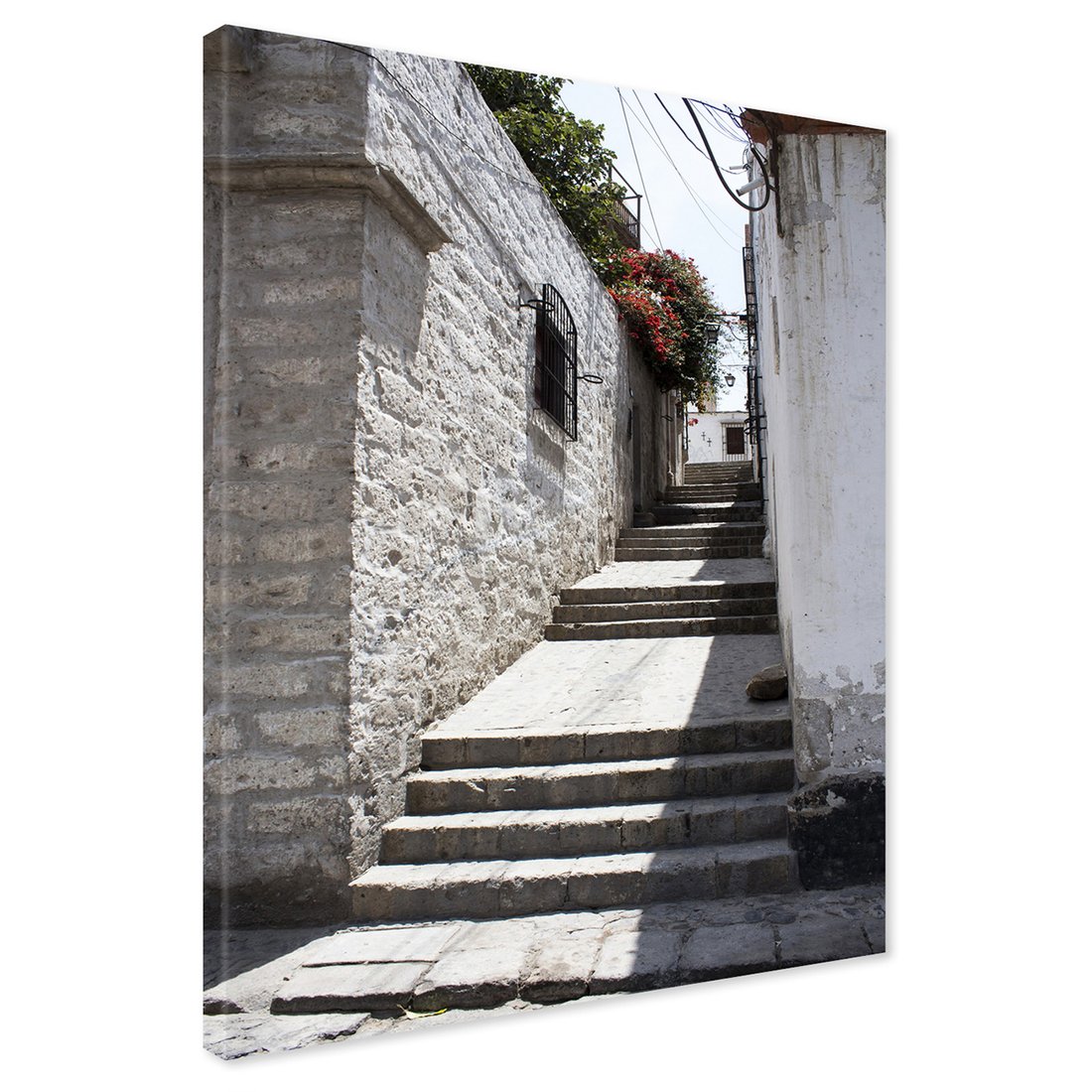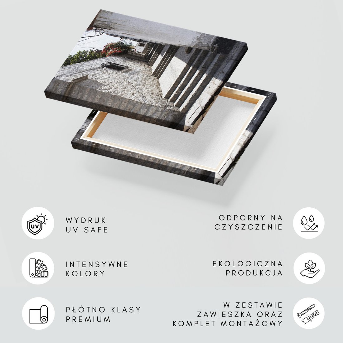 Obraz na płótnie z motywem uliczka, schody, miasto to kwintesencja estetyki i trwałości. Dzięki łatwemu montażowi i uniwersalnemu wzornictwu, czyni go idealnym wyborem zarówno do codziennego użytku, jak i na wyrafinowany prezent.