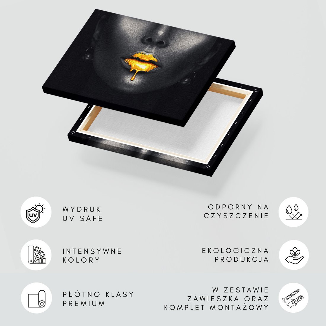 Obraz na płótnie z motywem usta, złoto, czarny to kwintesencja estetyki i trwałości. Dzięki łatwemu montażowi i uniwersalnemu wzornictwu, czyni go idealnym wyborem zarówno do codziennego użytku, jak i na wyrafinowany prezent.
