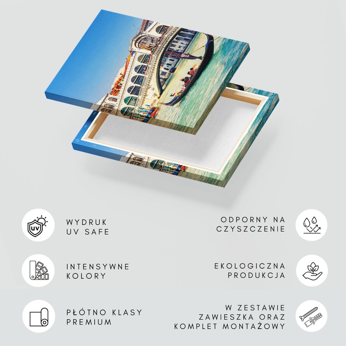 Obraz na płótnie z motywem Wenecja, gondola, most to kwintesencja estetyki i trwałości. Dzięki łatwemu montażowi i uniwersalnemu wzornictwu, czyni go idealnym wyborem zarówno do codziennego użytku, jak i na wyrafinowany prezent.