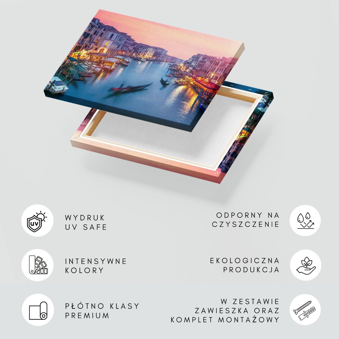 Obraz na płótnie z motywem Wenecja, kanał, gondole to kwintesencja estetyki i trwałości. Dzięki łatwemu montażowi i uniwersalnemu wzornictwu, czyni go idealnym wyborem zarówno do codziennego użytku, jak i na wyrafinowany prezent.