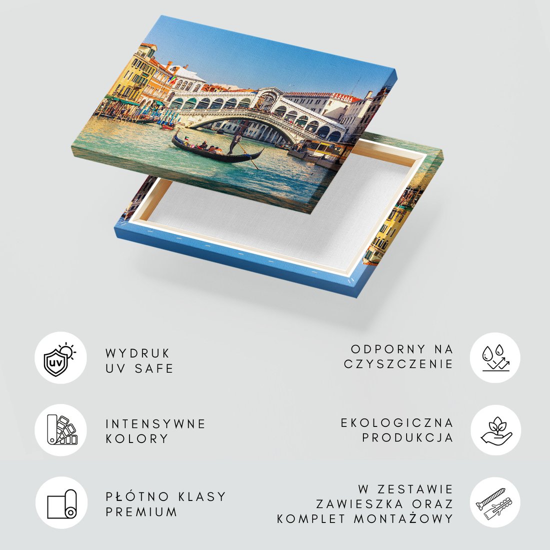 Obraz na płótnie z motywem Wenecja, most, gondola to kwintesencja estetyki i trwałości. Dzięki łatwemu montażowi i uniwersalnemu wzornictwu, czyni go idealnym wyborem zarówno do codziennego użytku, jak i na wyrafinowany prezent.