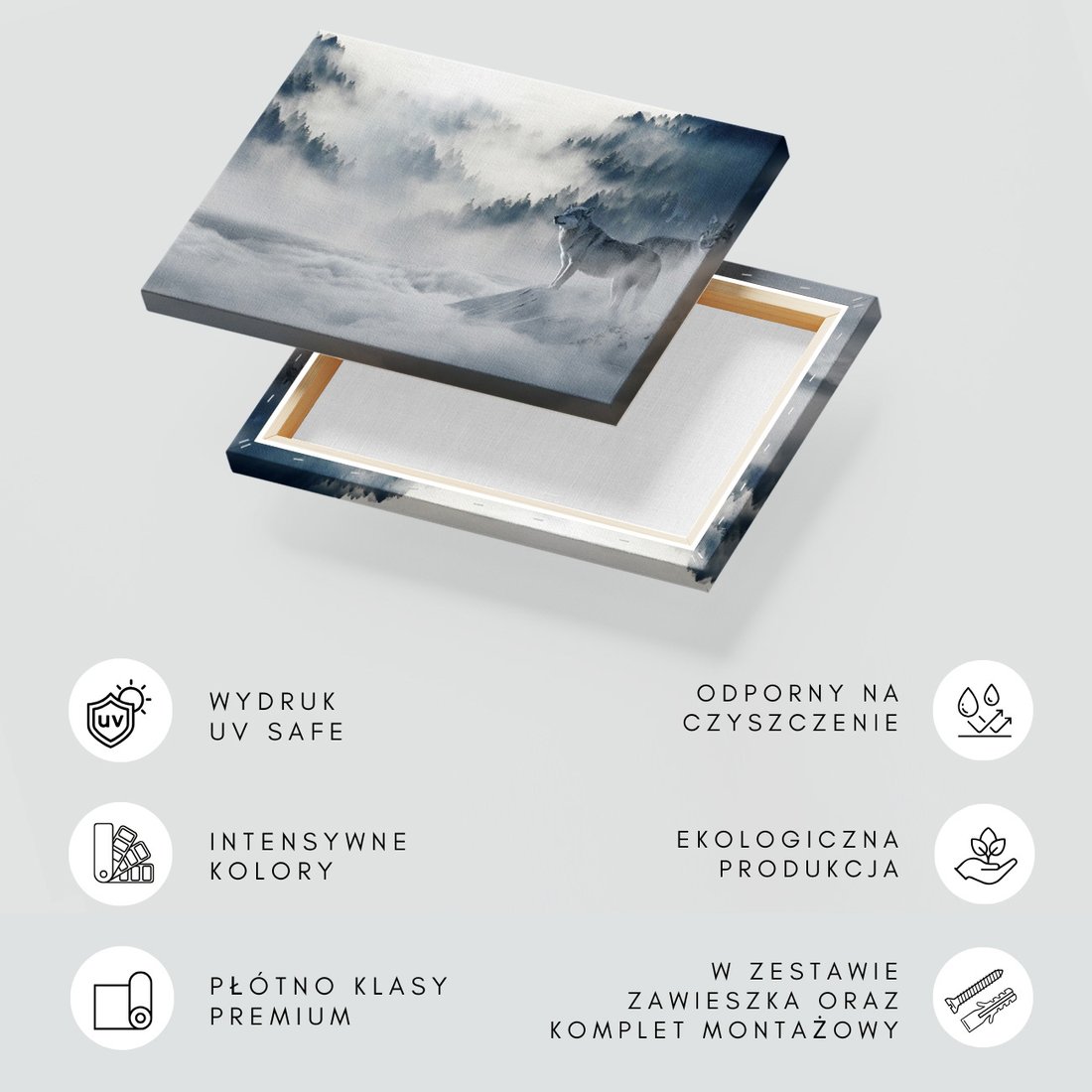 Obraz na płótnie z motywem wilki, mgła, lasy to kwintesencja estetyki i trwałości. Dzięki łatwemu montażowi i uniwersalnemu wzornictwu, czyni go idealnym wyborem zarówno do codziennego użytku, jak i na wyrafinowany prezent.