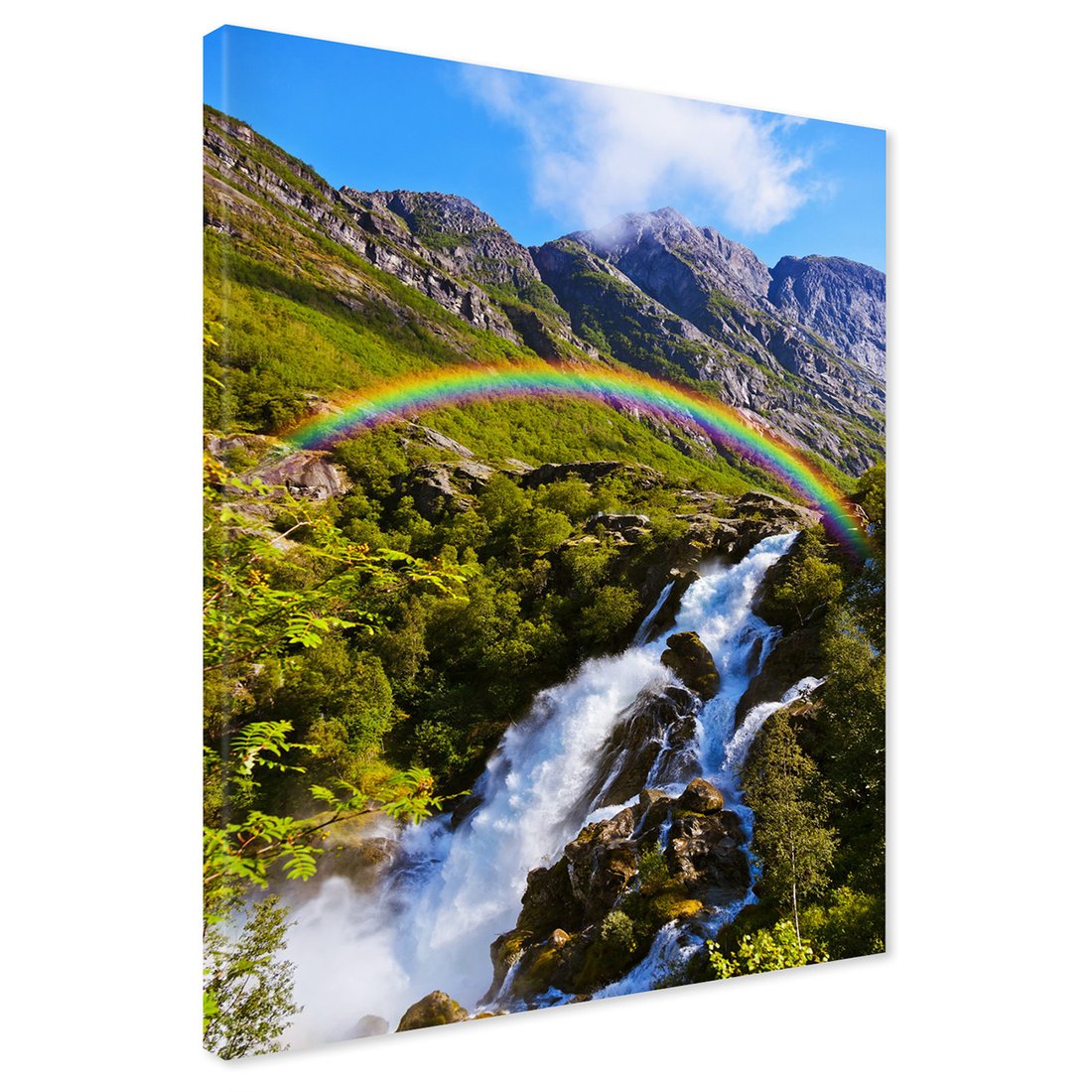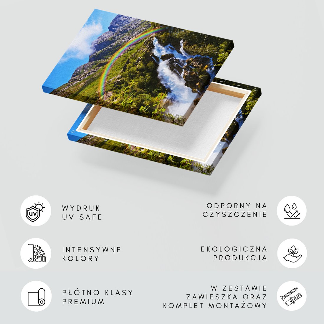 Obraz na płótnie z motywem wodospad, góry, tęcza to kwintesencja estetyki i trwałości. Dzięki łatwemu montażowi i uniwersalnemu wzornictwu, czyni go idealnym wyborem zarówno do codziennego użytku, jak i na wyrafinowany prezent.