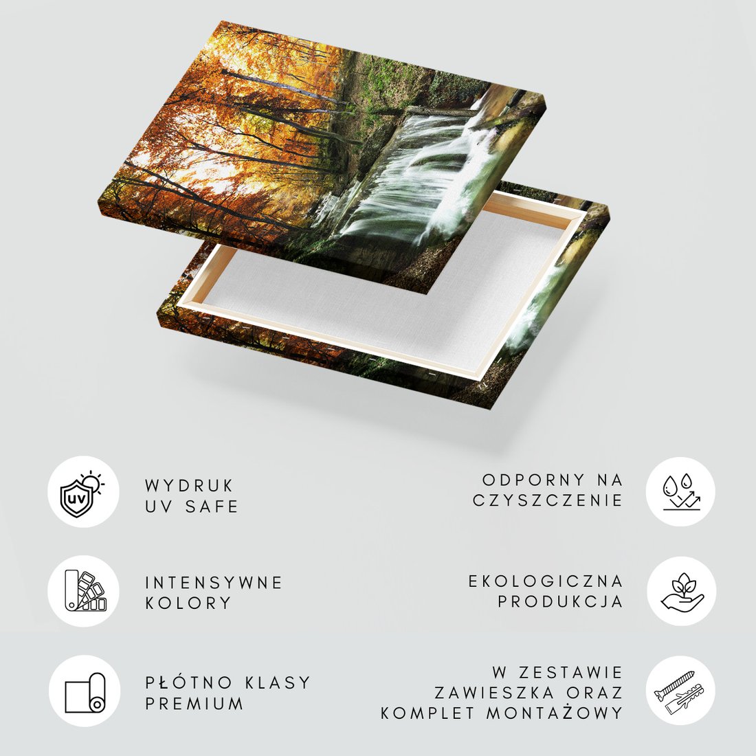 Obraz na płótnie z motywem wodospad, jesień, las to kwintesencja estetyki i trwałości. Dzięki łatwemu montażowi i uniwersalnemu wzornictwu, czyni go idealnym wyborem zarówno do codziennego użytku, jak i na wyrafinowany prezent.