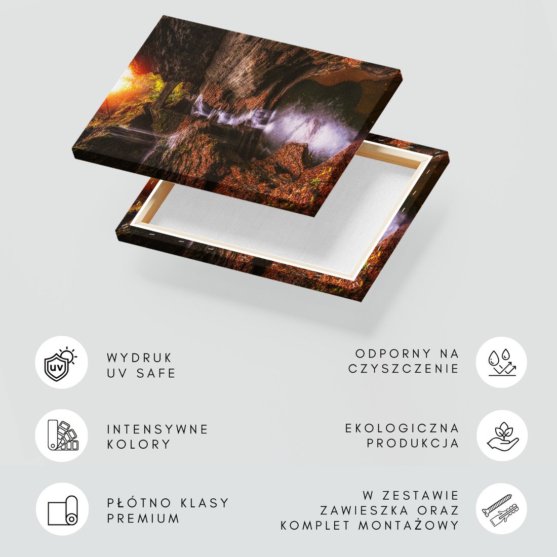 Obraz na płótnie z motywem wodospad, jesień, natura to kwintesencja estetyki i trwałości. Dzięki łatwemu montażowi i uniwersalnemu wzornictwu, czyni go idealnym wyborem zarówno do codziennego użytku, jak i na wyrafinowany prezent.