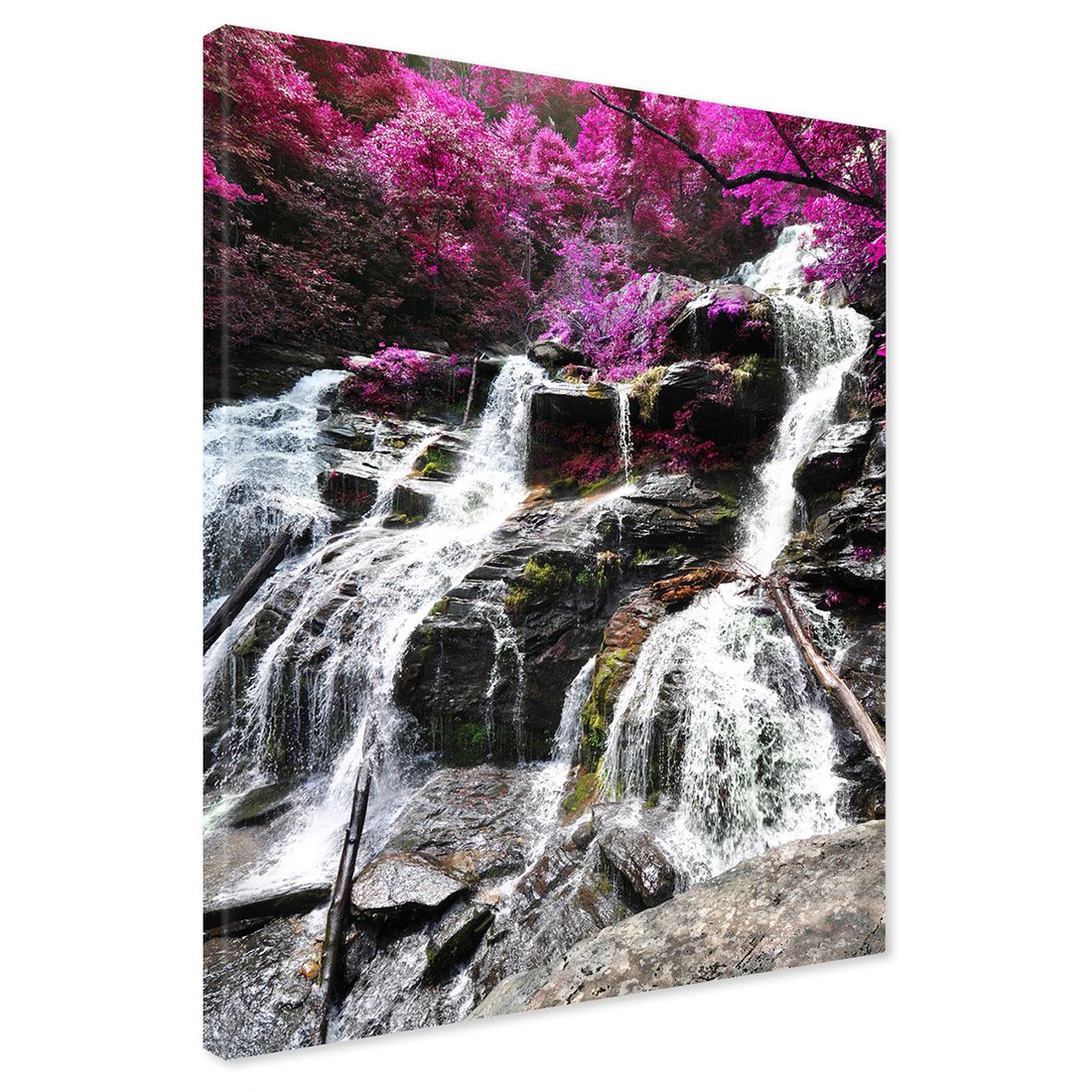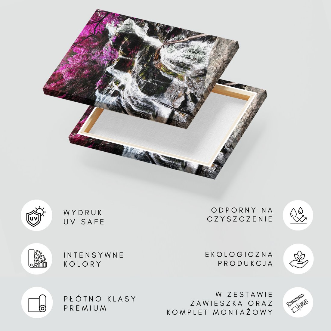 Obraz na płótnie z motywem wodospad, las, skały to kwintesencja estetyki i trwałości. Dzięki łatwemu montażowi i uniwersalnemu wzornictwu, czyni go idealnym wyborem zarówno do codziennego użytku, jak i na wyrafinowany prezent.