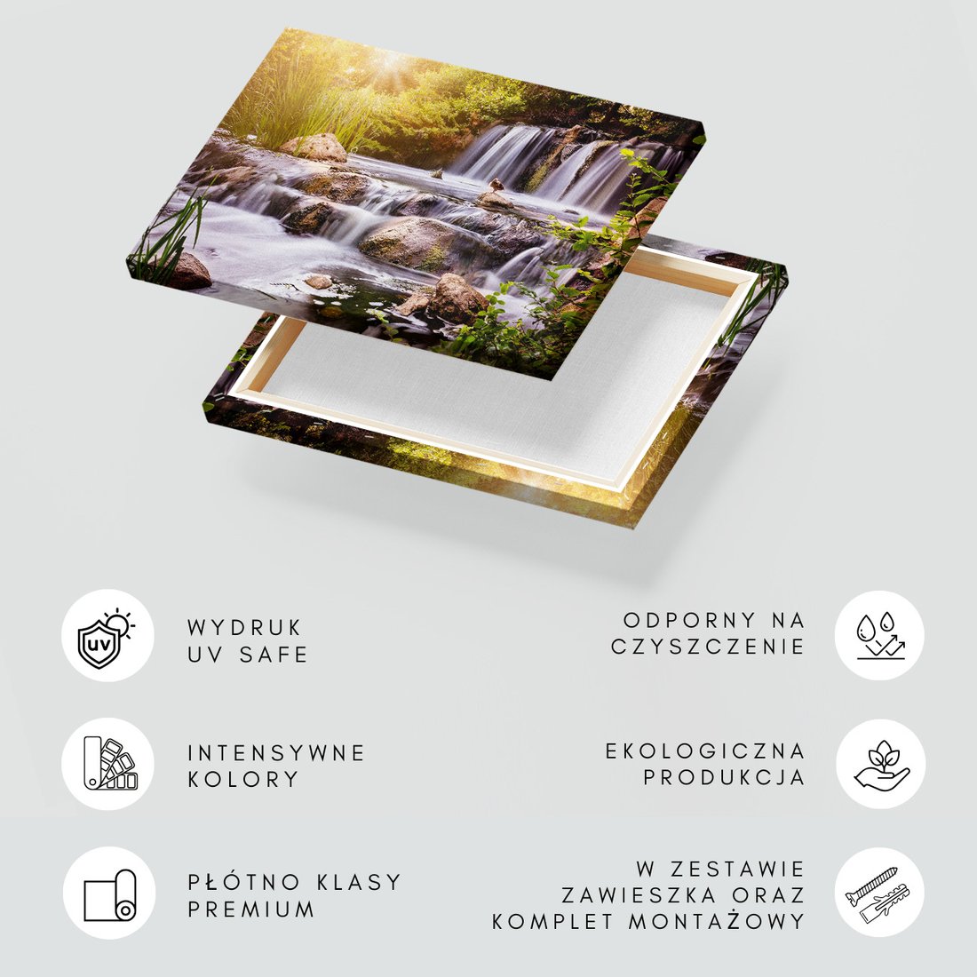 Obraz na płótnie z motywem wodospad, natura, woda to kwintesencja estetyki i trwałości. Dzięki łatwemu montażowi i uniwersalnemu wzornictwu, czyni go idealnym wyborem zarówno do codziennego użytku, jak i na wyrafinowany prezent.