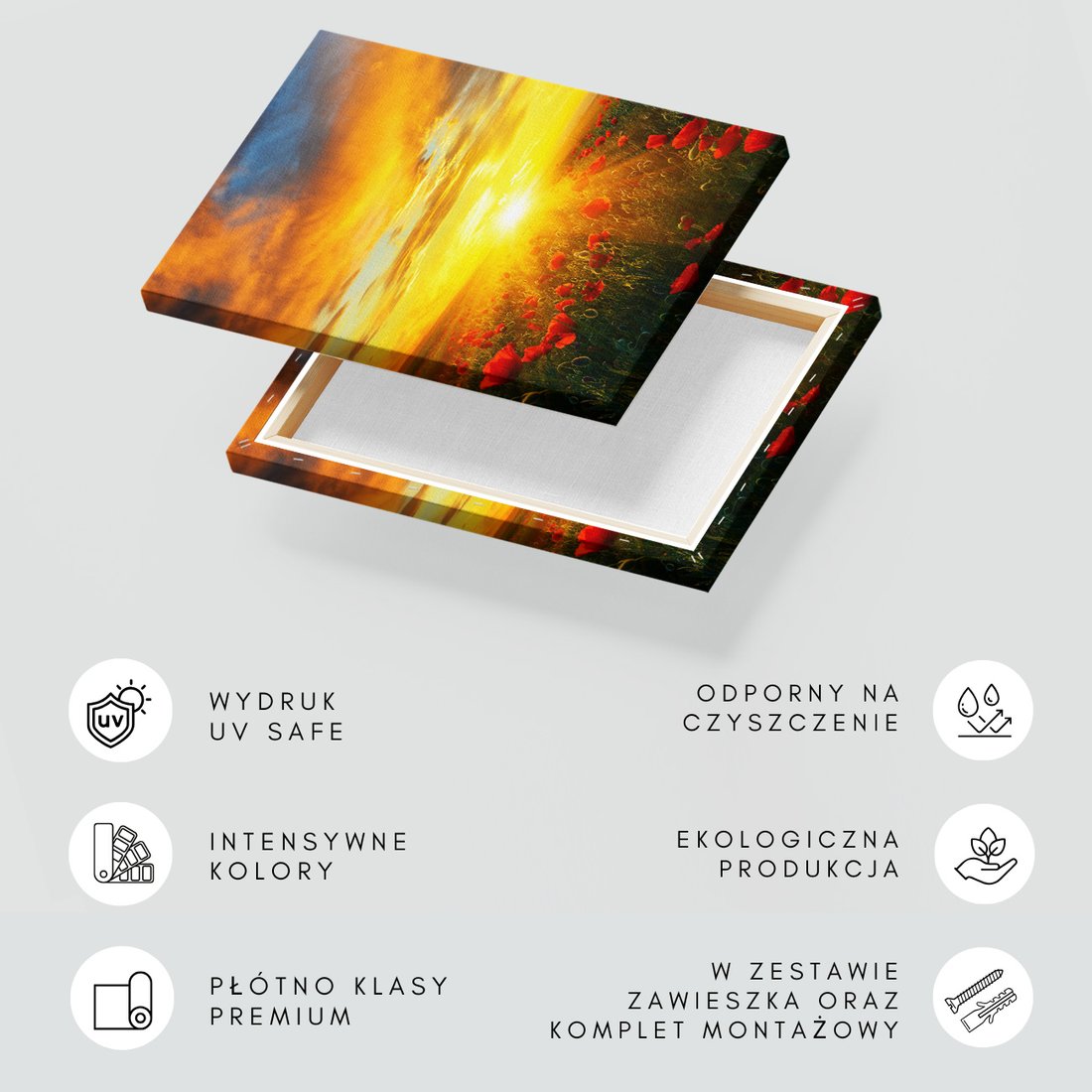 Obraz na płótnie z motywem zachód słońca, kwiaty, pole to kwintesencja estetyki i trwałości. Dzięki łatwemu montażowi i uniwersalnemu wzornictwu, czyni go idealnym wyborem zarówno do codziennego użytku, jak i na wyrafinowany prezent.