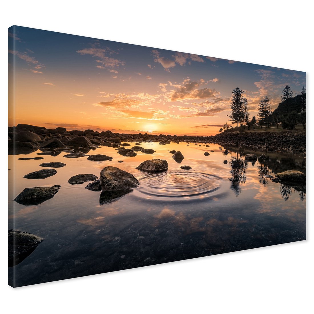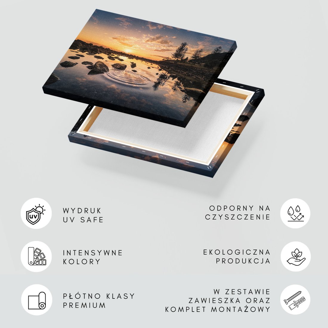Obraz na płótnie z motywem zachód słońca, woda, skały to kwintesencja estetyki i trwałości. Dzięki łatwemu montażowi i uniwersalnemu wzornictwu, czyni go idealnym wyborem zarówno do codziennego użytku, jak i na wyrafinowany prezent.