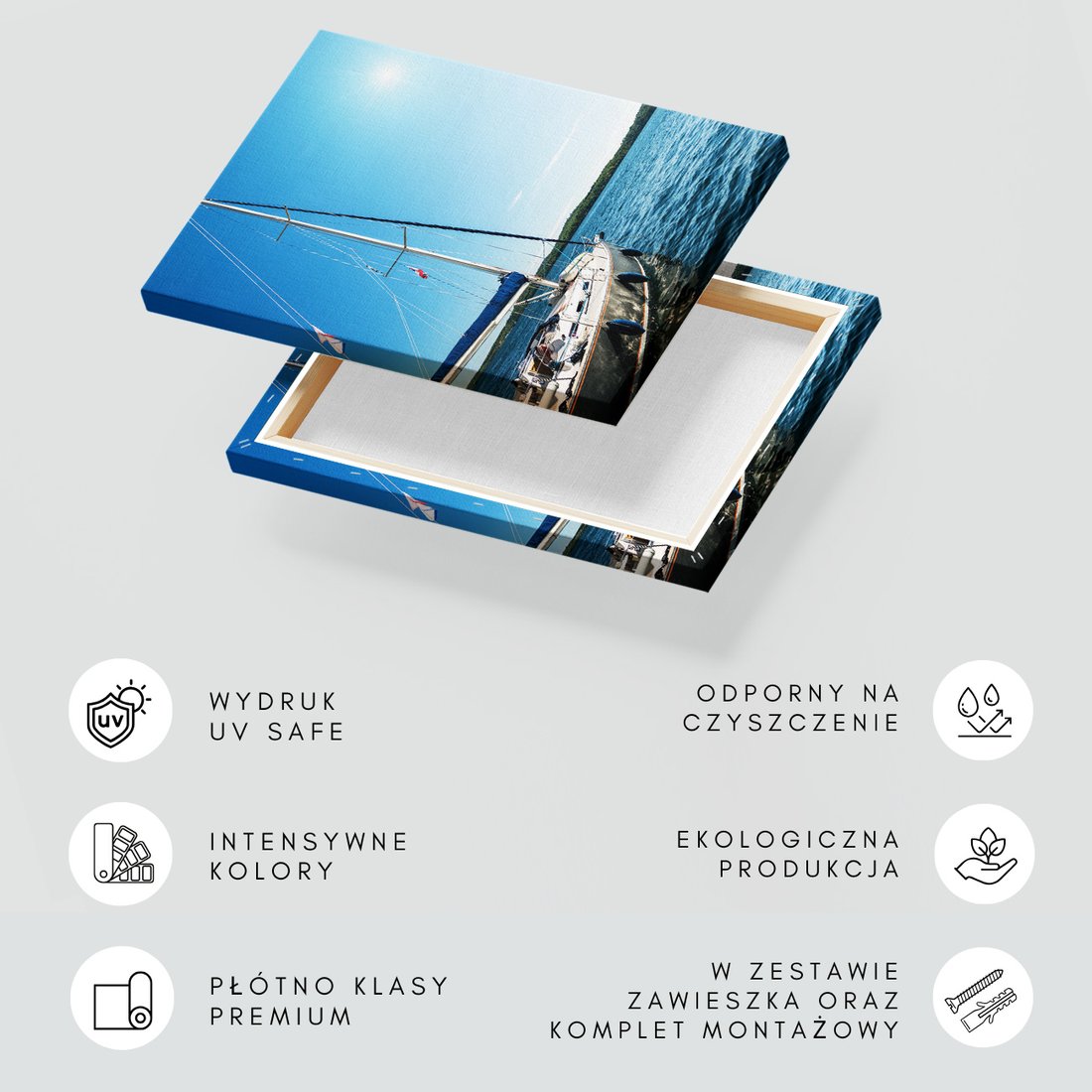 Obraz na płótnie z motywem żaglówka, morze, niebo to kwintesencja estetyki i trwałości. Dzięki łatwemu montażowi i uniwersalnemu wzornictwu, czyni go idealnym wyborem zarówno do codziennego użytku, jak i na wyrafinowany prezent.