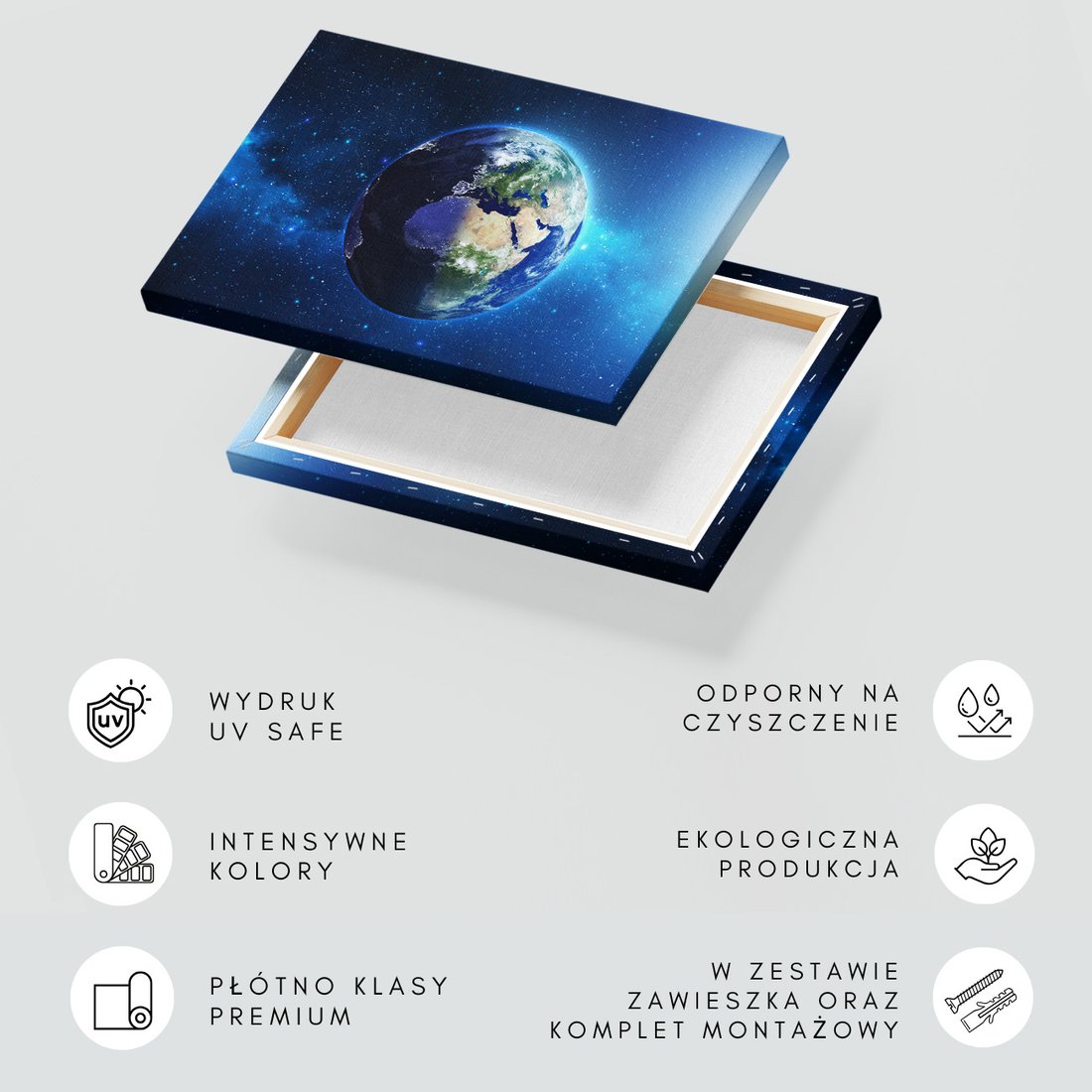 Obraz na płótnie z motywem ziemia, kosmos, planeta to kwintesencja estetyki i trwałości. Dzięki łatwemu montażowi i uniwersalnemu wzornictwu, czyni go idealnym wyborem zarówno do codziennego użytku, jak i na wyrafinowany prezent.