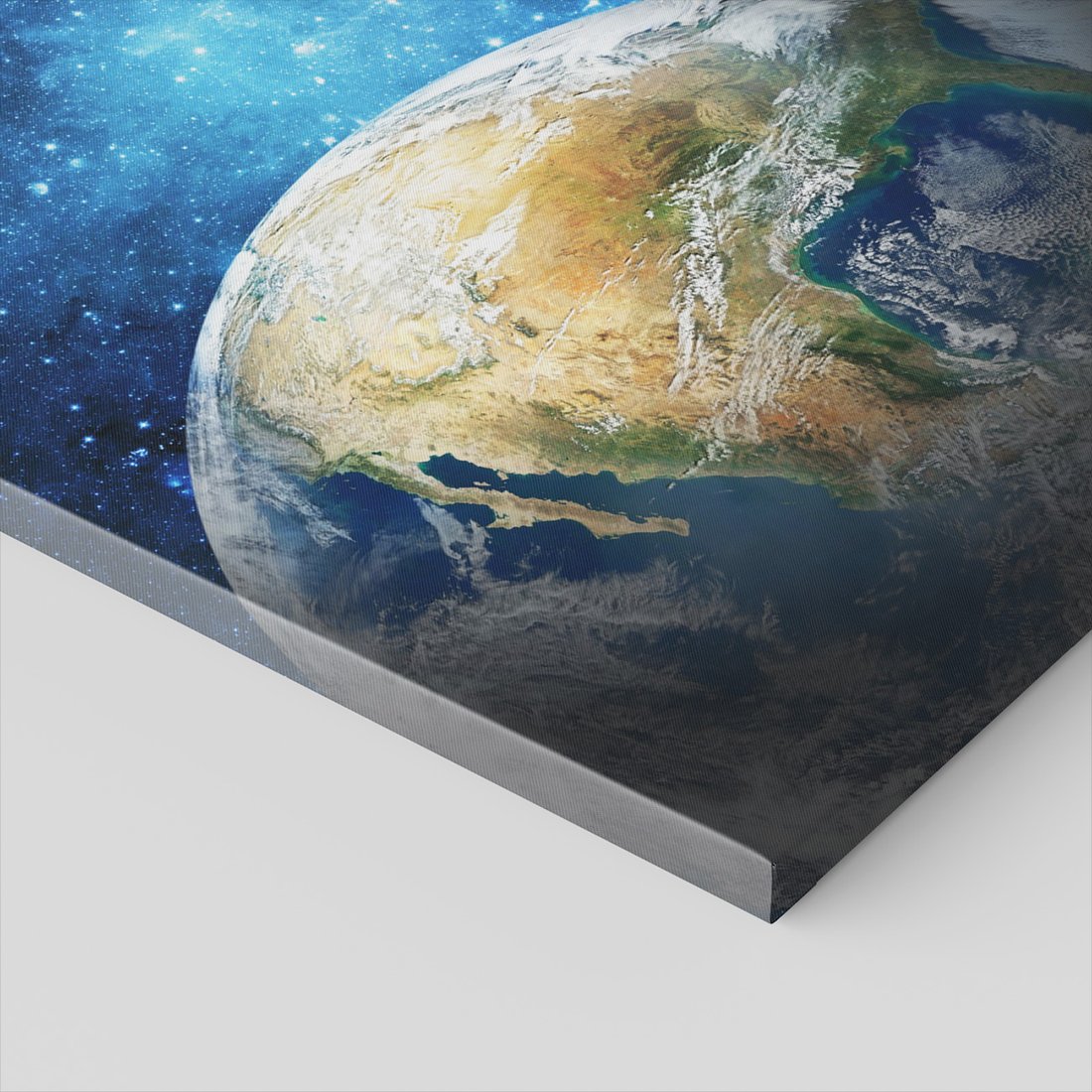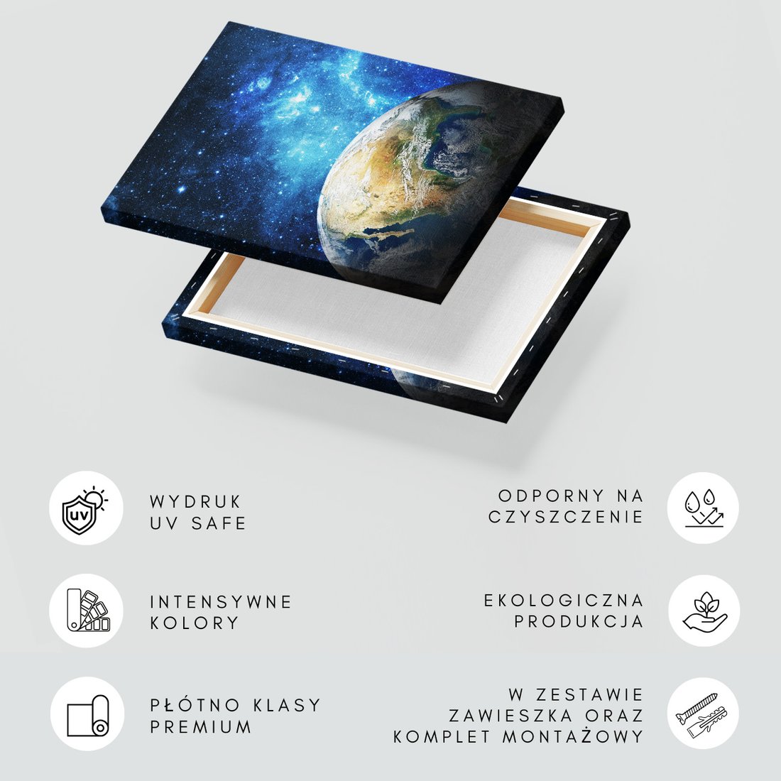 Obraz na płótnie z motywem ziemia, kosmos, planeta to kwintesencja estetyki i trwałości. Dzięki łatwemu montażowi i uniwersalnemu wzornictwu, czyni go idealnym wyborem zarówno do codziennego użytku, jak i na wyrafinowany prezent.