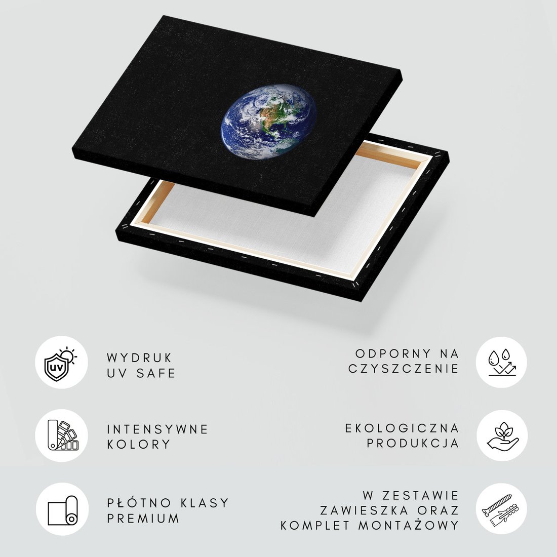 Obraz na płótnie z motywem ziemia, planeta, kosmos to kwintesencja estetyki i trwałości. Dzięki łatwemu montażowi i uniwersalnemu wzornictwu, czyni go idealnym wyborem zarówno do codziennego użytku, jak i na wyrafinowany prezent.
