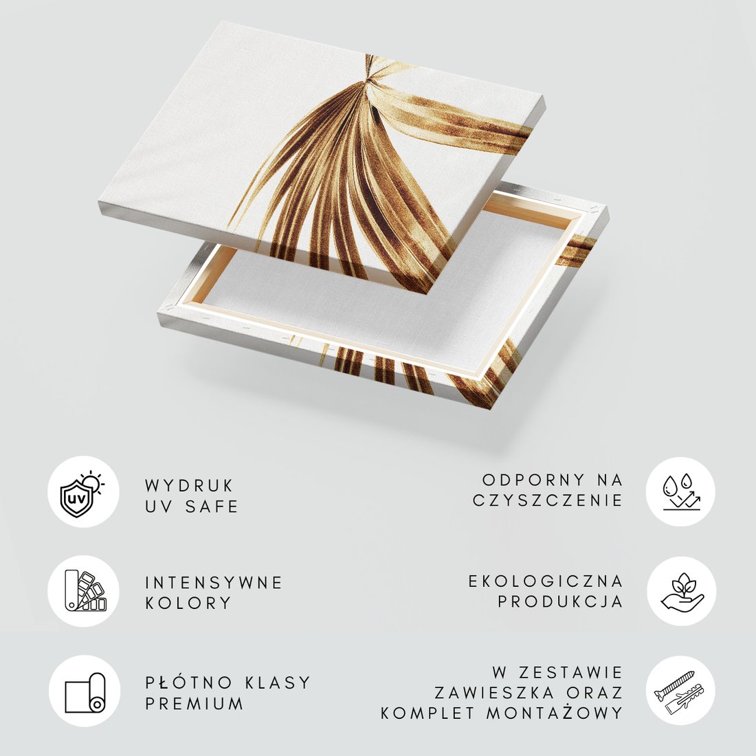 Obraz na płótnie z motywem złoty, liść, minimalizm to kwintesencja estetyki i trwałości. Dzięki łatwemu montażowi i uniwersalnemu wzornictwu, czyni go idealnym wyborem zarówno do codziennego użytku, jak i na wyrafinowany prezent.