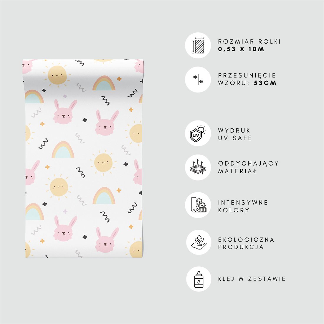 Odkryj piękno i funkcjonalność tapety z motywem dziecięca, królik, słońce, tęcza. To połączenie wyjątkowego wzornictwa z łatwością aplikacji, doskonałe do każdego pomieszczenia.