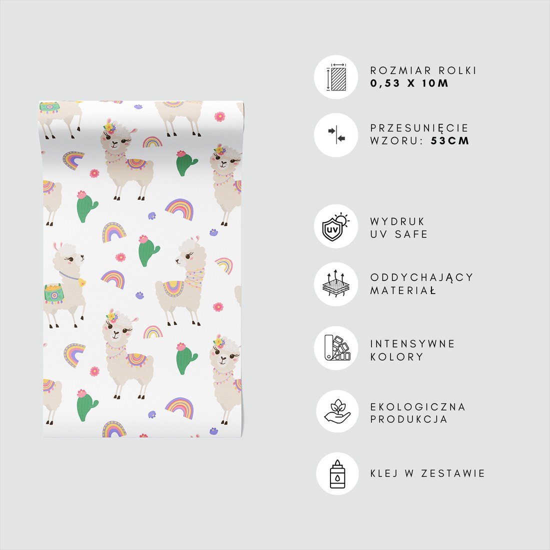 Odkryj piękno i funkcjonalność tapety z motywem dziecięca, lama, kaktus, tęcza. To połączenie wyjątkowego wzornictwa z łatwością aplikacji, doskonałe do każdego pomieszczenia.