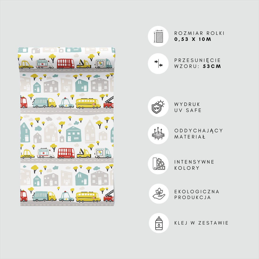 - Tapeta - dziecięca, miasto, pojazdy, drzewa