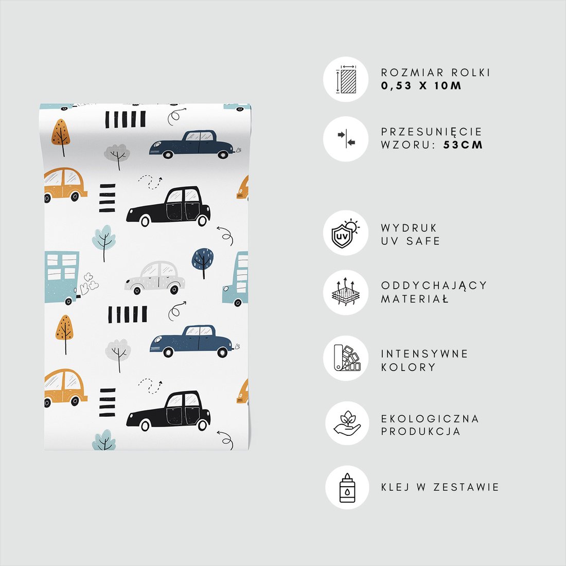 • Tapeta - dziecięca, samochody, drzewa, pasy