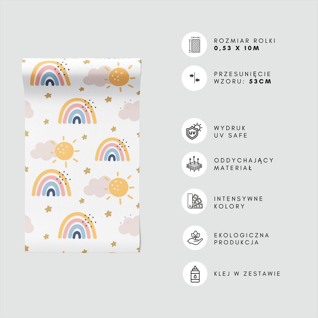 Odkryj piękno i funkcjonalność tapety z motywem dziecięca, tęcza, słońce, gwiazda. To połączenie wyjątkowego wzornictwa z łatwością aplikacji, doskonałe do każdego pomieszczenia.
